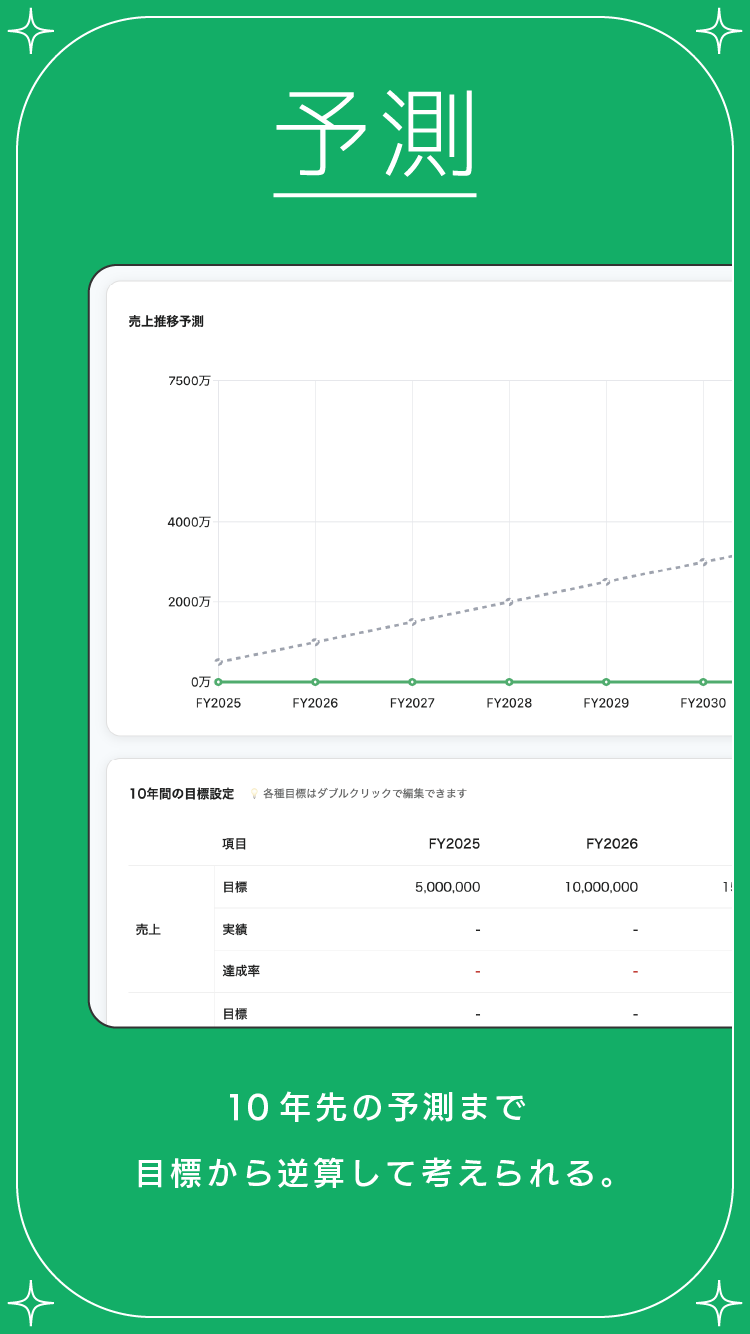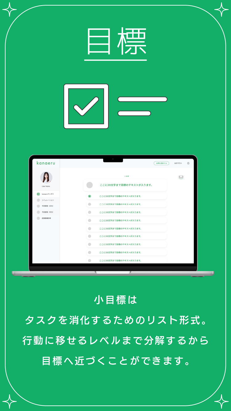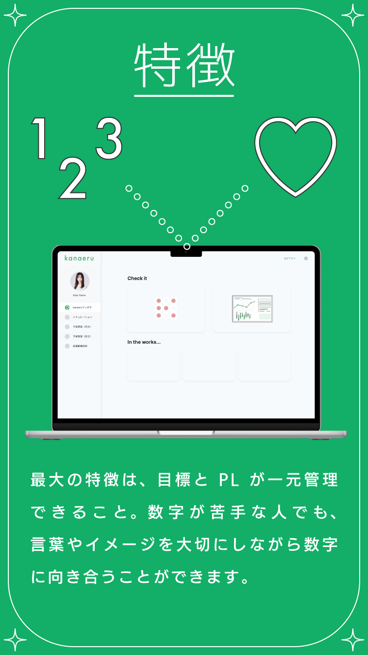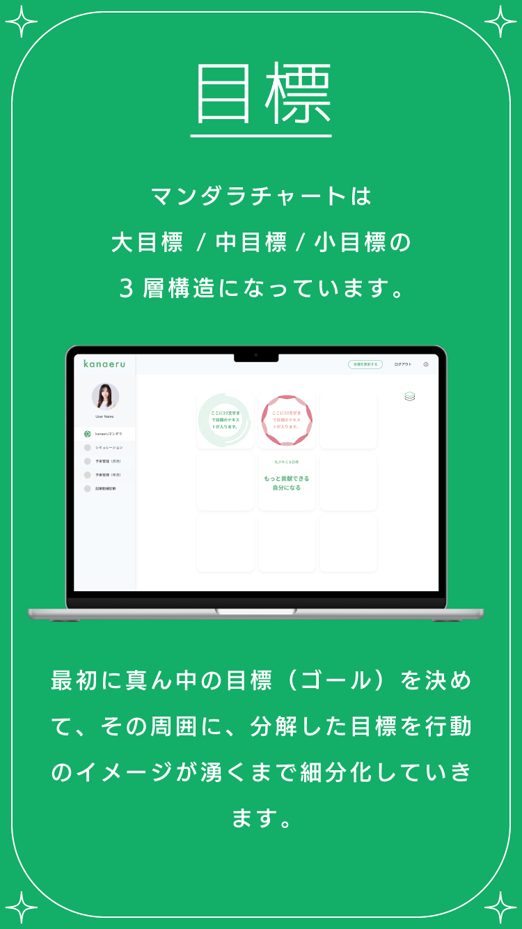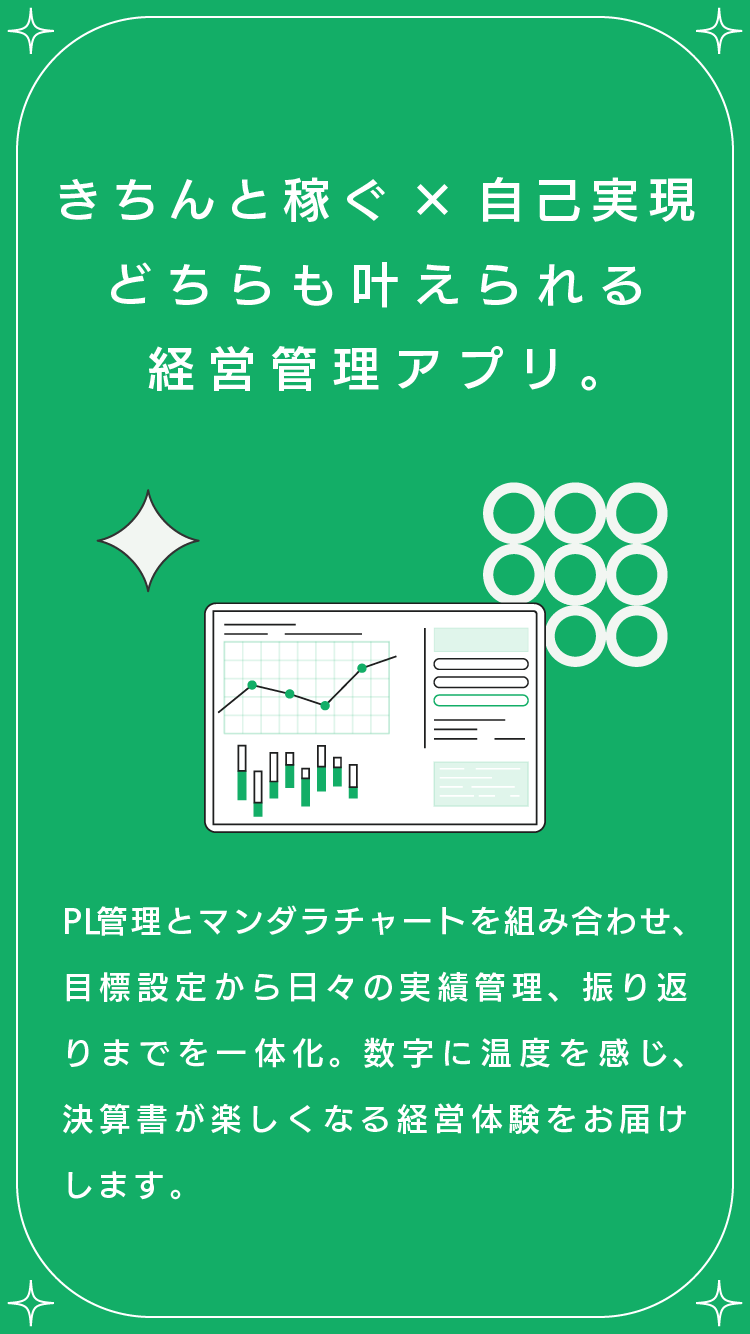 kanaeruは、数字が苦手な小規模事業者や個人経営者のための“叶える経営”アプリ。予実管理とマンダラチャートを組み合わせ、目標設定から日々の実績管理、振り返りまでを一元管理。